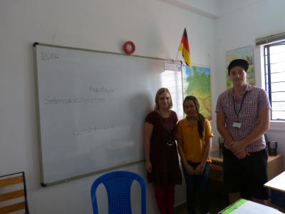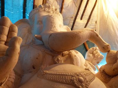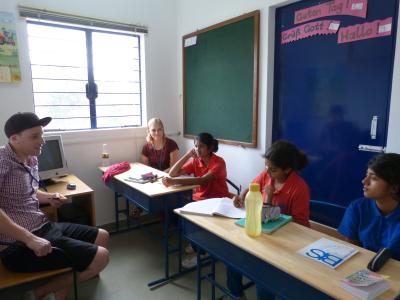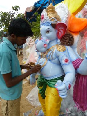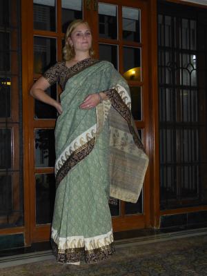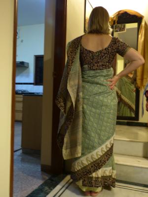 Knoten Sie die beiden Zipfel so zusammen, dass Sie einen gut sitzenden Rock, mit einem Schlitz zur Rechten, erzeugen. Führen Sie nun die verbleibenden ca. 4-5 m Stoff von rechts vor ihren Körper und falten Sie mit ca. 1 Meter des direkt am Körper liegenden Stoffes eine Ziehharmonika. Dabei legen Sie die Falten nach innen (links) hin, d.h. die letzte von Ihnen gelegte Falte liegt beim folgenden Schritt unten. Es sollten ca. 4-5 Falten mit einer Zirkabreite von 20 cm entstehen. Diese Stoffziehharmonika stecken Sie mittig vorne in Ihrem Bund fest. Zur Sicherheit können Sie dieses Stück auch mit einer großen Sicherheitsnadel einmal feststecken. Ca. 2,5-3 m Stoff sind hiernach verblieben. Diesen führen Sie linksherum, hinter Ihrem Rücken, um die Taille wieder zur rechten Seite durch. Somit haben Sie auf Ihrer Rückseite eine 2. Lage Stoff angelegt. Das schöne, geschmückte aufwendige Ende Ihres Saris, der Paluv, liegt nun in Ihrer rechten Hand. Greifen Sie den Stoff in der Höhe mit der rechten Hand, die Sie benötigen, um den Stoff zur linken Schulter, quer über Ihren Oberkörper zu führen. Legen Sie dieses Stück, welches Sie wieder in Ziehharmonikafalten gelegt haben ( ca. 5 Falten à 20 cm) über Ihre linke Schulter, wobei der schöne Paluv hinten herunter hängt. An der Schulter können Sie die Stoffziehharmonika auch mit einer kleinen Sicherheitsnadel feststecken damit er nicht mehr verrutschen kann. Ihr Oberkörper ist nun durch den Saristoff von Ihrer rechten Hüfte, quer über den Brustkorb bis zur linken Schulter bedeckt.
